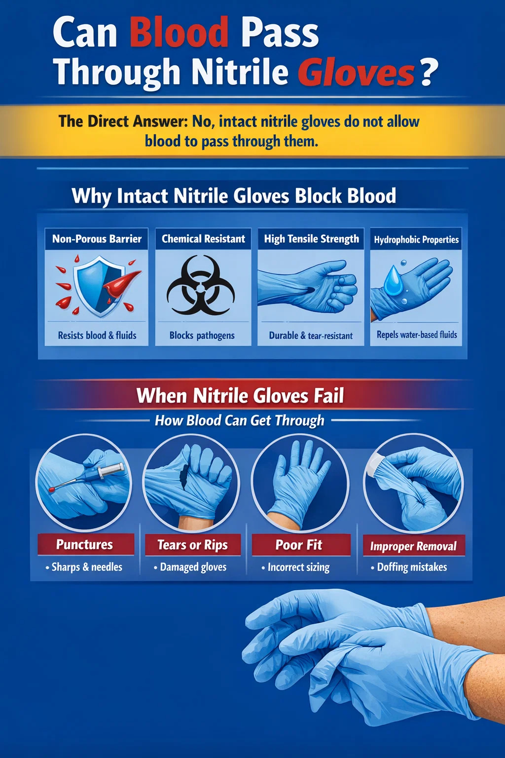 Tuttavia, la parola "intatto" ha un peso enorme in tale affermazione. Il sangue, o gli agenti patogeni in esso contenuti, possono raggiungere la pelle se un guanto viene strappato, forato, presenta un difetto di fabbricazione non rilevato o viene utilizzato in modo errato. Il materiale dei guanti in sé non assorbe né consente la permeazione passiva del sangue in condizioni di utilizzo standard, ma le violazioni fisiche cambiano tutto.