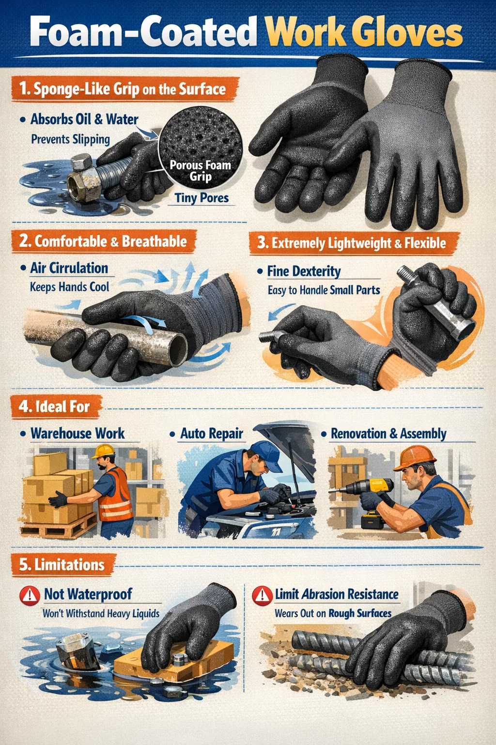 Riparazione automobilistica: quando si ha a che fare con parti oleose, i guanti in schiuma offrono sia resistenza all'olio che una presa sicura. Ristrutturazione e assemblaggio: quando si utilizzano trapani elettrici e si serrano viti, questi guanti forniscono una protezione adeguata senza compromettere la destrezza.