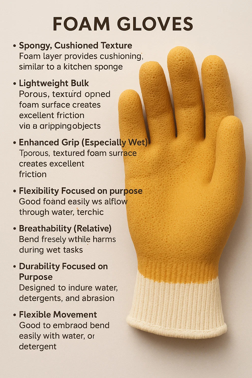 Guanti in schiuma sono definiti dalla loro struttura materiale unica e dai tratti funzionali. Ecco le loro caratteristiche principali: