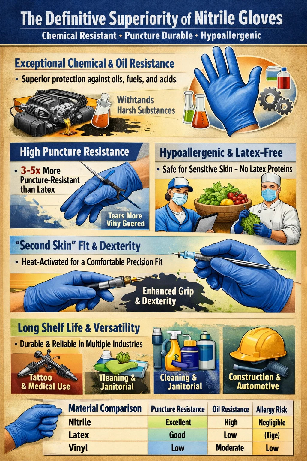 Nel industria del tatuaggio , si preferisce il nitrile nero perché nasconde le macchie di inchiostro e resiste alla vaselina utilizzata durante il processo. Dentro lavoro di pulizie , proteggono dai detergenti a base di candeggina e ammoniaca che penetrerebbero facilmente attraverso guanti in vinile più economici. Questa versatilità dimostra che il nitrile non è solo un'altra opzione usa e getta: è uno strumento specializzato per la sicurezza.