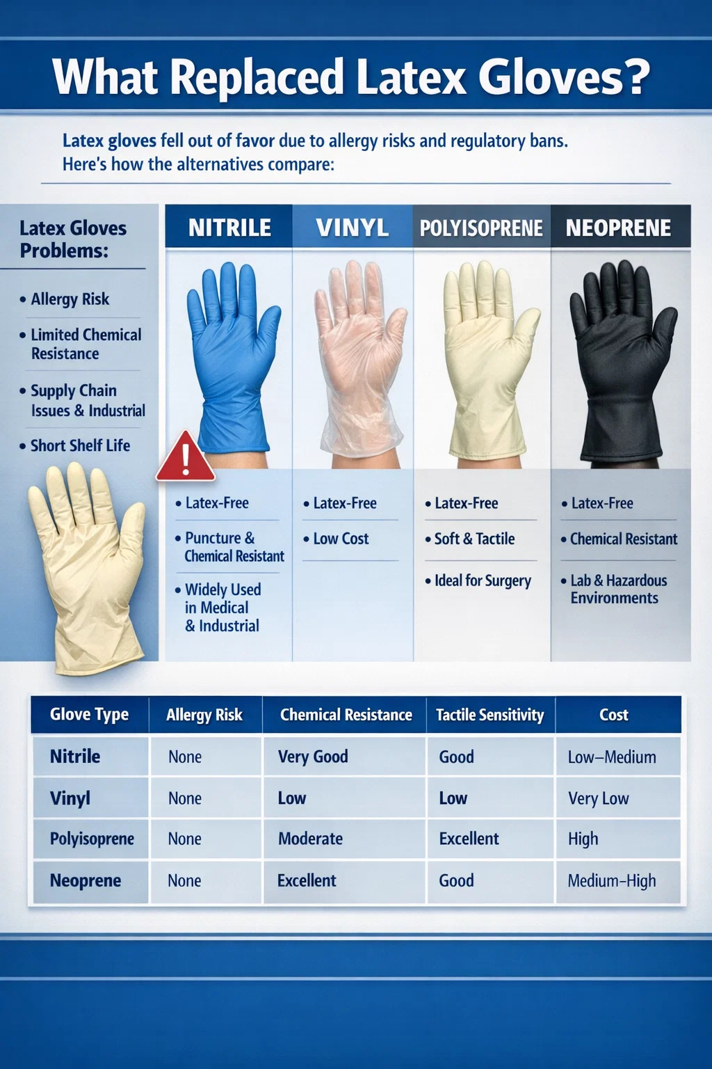 Detto questo, il nitrile non è l’unico sostituto. I guanti in vinile, neoprene, poliisoprene e polimeri ibridi occupano ciascuno nicchie specifiche a seconda del compito, della sensibilità richiesta, delle esigenze di resistenza chimica e del budget. Questo articolo li esamina tutti in dettaglio, spiegando perché è avvenuto il passaggio dal lattice, cosa offrono le alternative e come scegliere quello giusto per il tuo caso d'uso specifico.