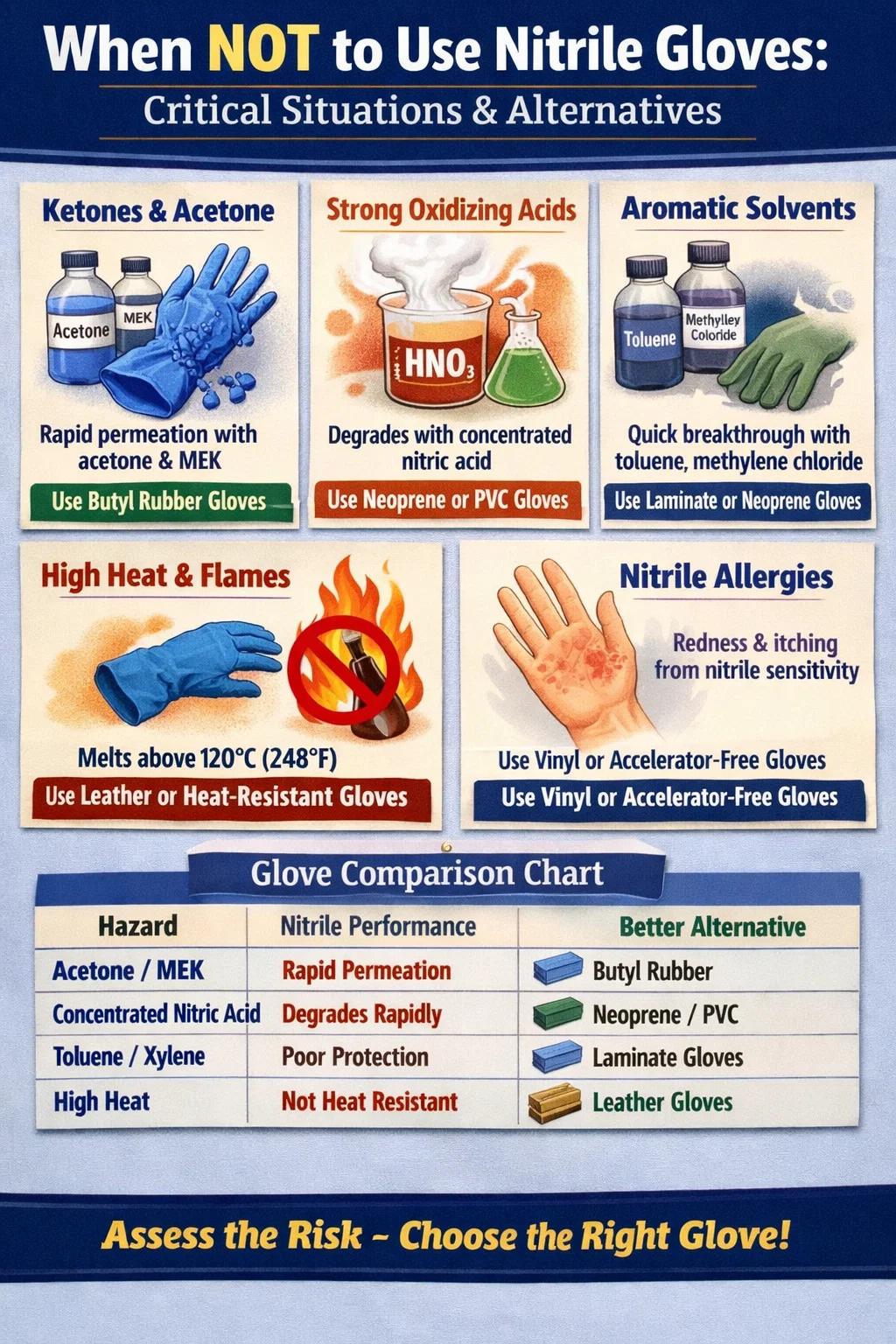 La risposta breve: evitare i guanti in nitrile quando si maneggiano determinati chetoni, acidi ossidanti forti o solventi altamente concentrati; quando si lavora con calore estremo o fiamme libere; quando la destrezza tattile è fondamentale e la durata del compito è breve; o quando la persona che li indossa ha una sensibilità documentata al nitrile. Continua a leggere per il dettaglio completo.