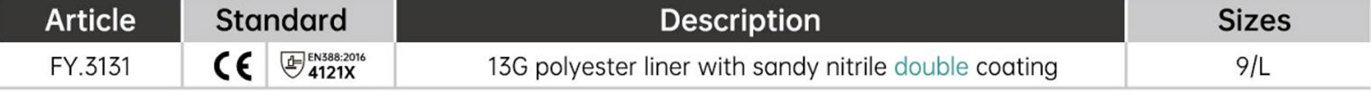 Il doppio rivestimento del palmo in nitrile con finitura sabbiata offre un'elevata resistenza all'olio e una buona presa in condizioni asciutte, bagnate e oleose.